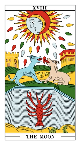 A lua ilumina a noite, mas de maneira imperfeita. As coisas não parecem como realmente são. Pode deixar tudo em volta mais assustador do que é – um arbusto pode parecer um monstro – ou pode fazer as coisas parecerem mais bonitas do que são, poetizadas por essa luz romântica e suave. Você está numa região de não saber mais se suas ideias vão te levar a algum lugar, porque tudo a sua volta é tão incerto. Uma hora parece bonito, outras horripilante. O caminho que a estrela parecia indicar agora está obscurecido pela luz mais forte, mas mais enganadora da lua. Existem caminhos que aparecem que não devem ser usados, te afastam do que você quer. Um homem bonito, mas desonesto, talvez, que aparece prometendo coisas que não cumprirá. Mais uma vez é esperado que se use a intuição porque a lógica não resolve. Perto de materializar seu sonho, mil vampiros aparecem, mil enganações, mil testes para ver sua determinação em não abandonar sua inspiração inicial. O sol está perto, mas perto dos locais de entrada para ele, criaturas da noite tentam já pegar aquilo que você está prestes a receber. Vampiros, lobos…